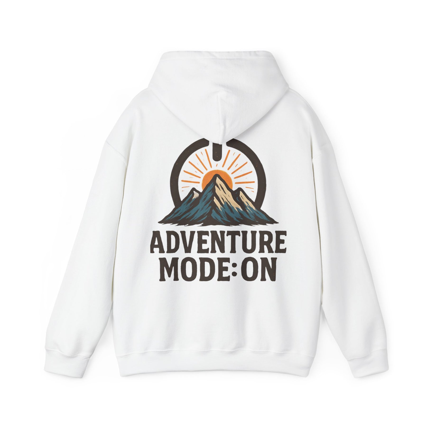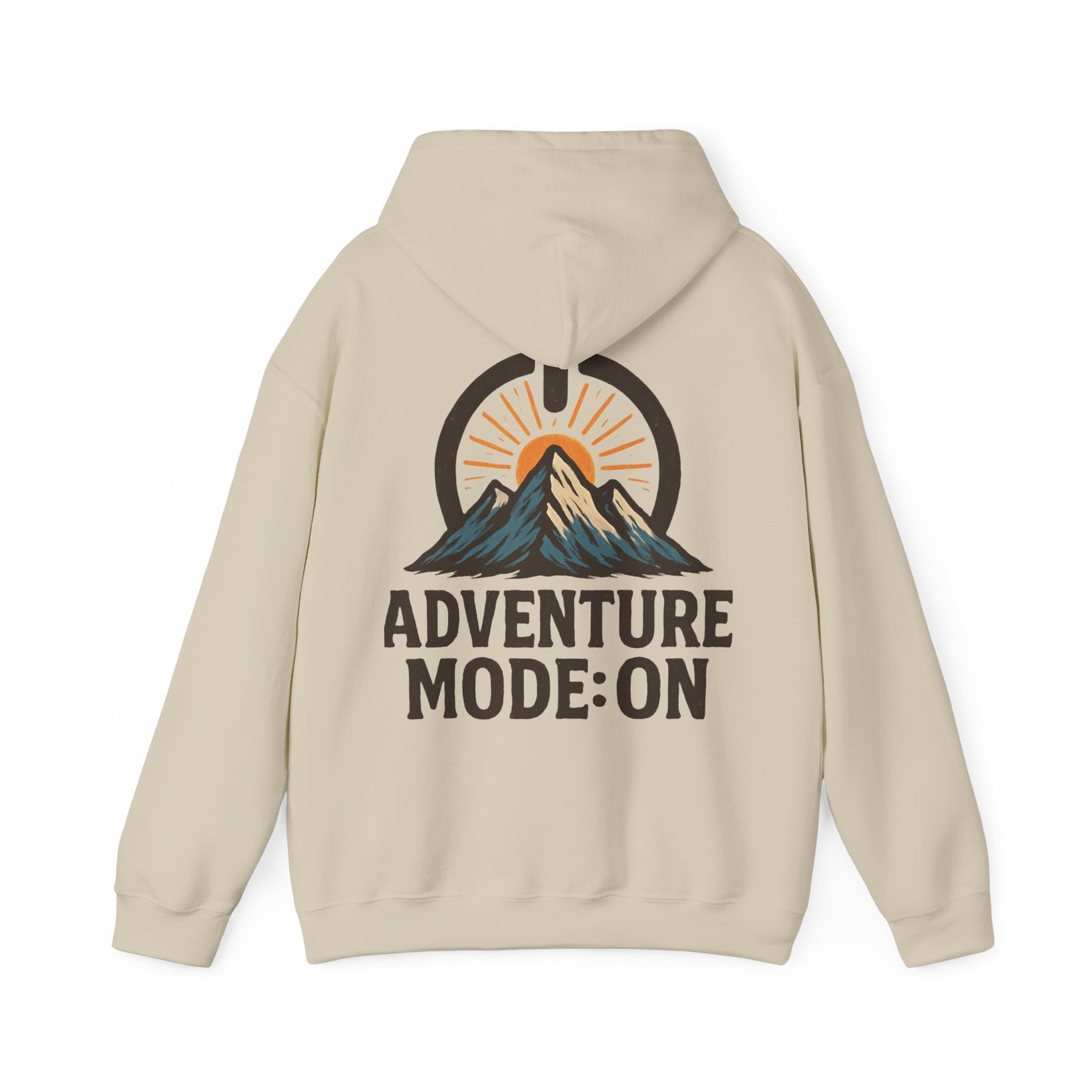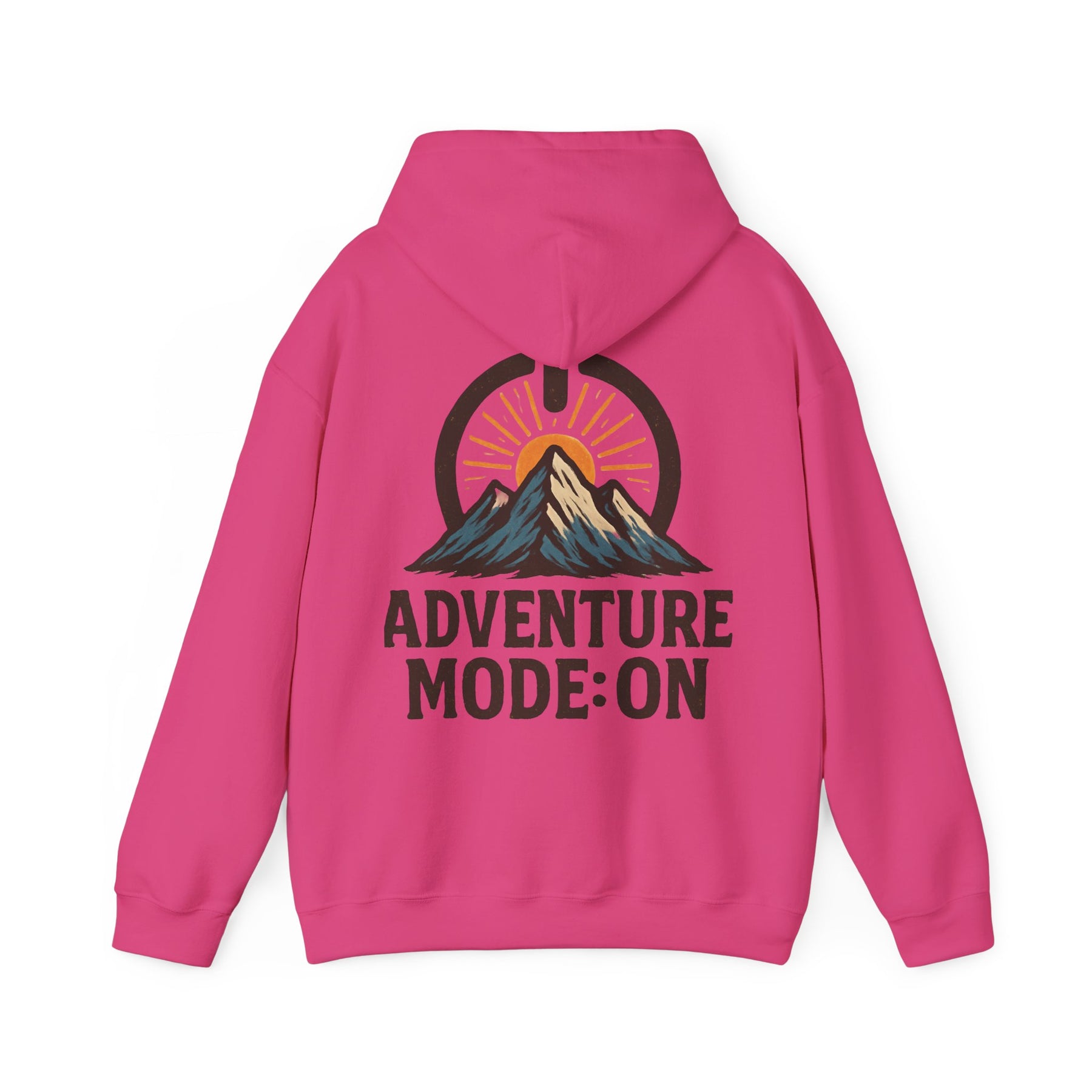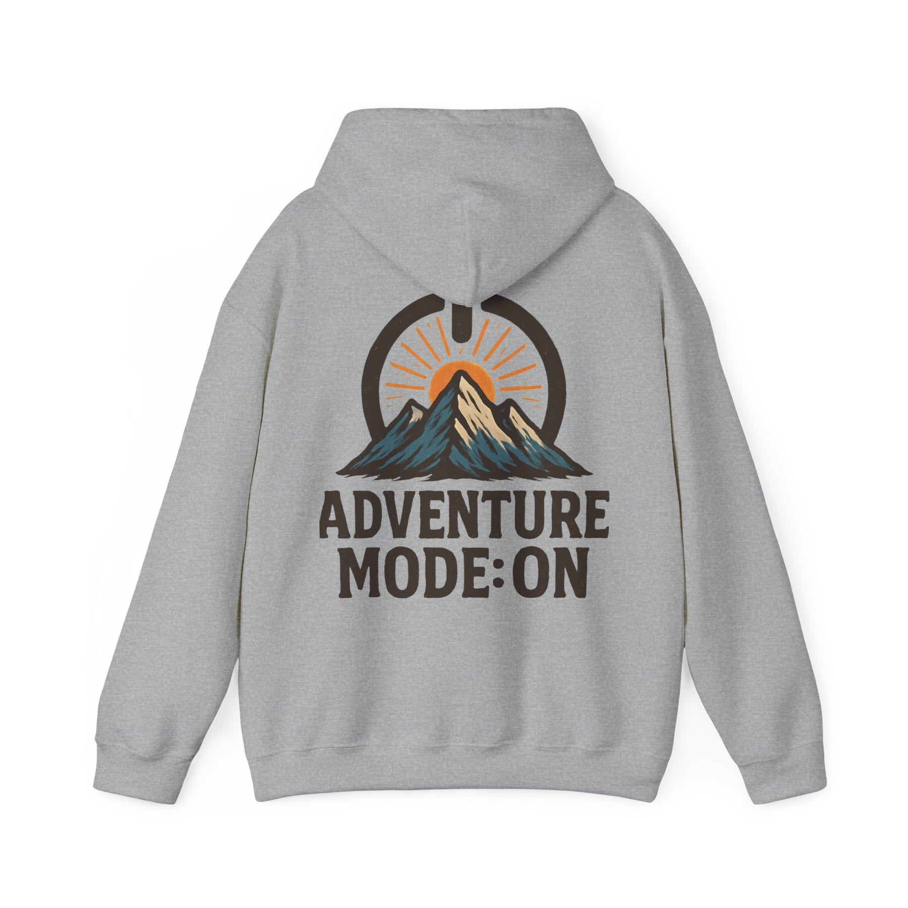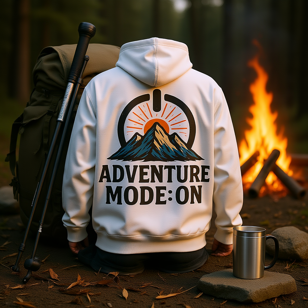 This roomy, mid-weight hoodie brings that first-sip-of-coffee morning-on-the-trail energy to everyday life. Soft, brushed interior and a roomy kangaroo pocket keep hands warm after sunrise hikes or late-night campfire talks. The front and back graphics — a rising sun behind rugged peaks and the bold line “ADVENTURE MODE: ON” — speak to people who chase trailheads, weekend drives, and spontaneous road trips. Wear it to warm up at the trailhead, throw it over a tee after a day of exploring, or keep one in the car for dawn patrols. It’s comfortable, durable, and made to move with you when the path calls.