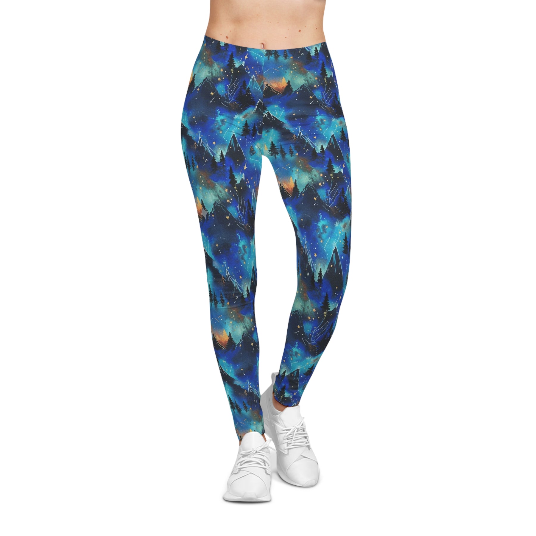 These leggings bring the night sky into everyday wear. Deep blues, turquoise auroras and tiny starlight accents form a layered landscape of silhouetted pines and distant peaks. Wear them for slow morning coffees, evening walks, or layered under a long sweater—each movement catches the silky print and lets the colors shimmer. They feel like a quiet hike after dusk: calm, a little wild, and entirely yours.