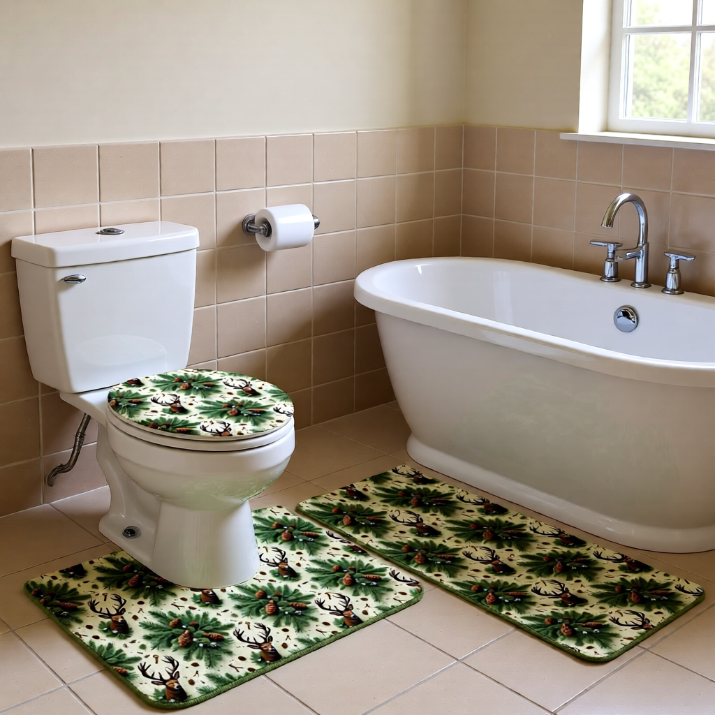 Bring a quiet, woodsy calm into your bathroom with this three-piece flannel set. Soft, napped flannel printed with hand-drawn stag heads, pine branches and cones creates a cozy cabin mood every time you step in. The pieces — square floor mat, U-shaped contour mat and padded toilet seat cover — are cushioned with an eco-friendly high-density sponge that soaks up moisture while staying breathable. A dot-molded non-slip backing keeps everything in place on tile or wood. It’s the kind of small detail that turns a routine room into a warm, nature‑inspired corner of the home, especially nice for those who love rustic lodge décor or seasonal winter styling.