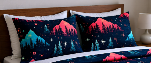 Lay your head down on a slice of night sky. This microfiber pillowcase wraps a dreamy mountain-and-forest illustration in deep navy, glowing coral peaks, and soft teal trees. The print flows edge-to-edge on both sides, so the scene reads from any angle. It feels smooth and lightweight against skin, dries quickly, and keeps its color and softness through regular machine washing. Tuck it into your cabin bed, stack it on a reading nook, or pair it with plain linens to let the art anchor the room. The result is a small, everyday escape—quiet, slightly cosmic, and made for slow evenings under warm light.