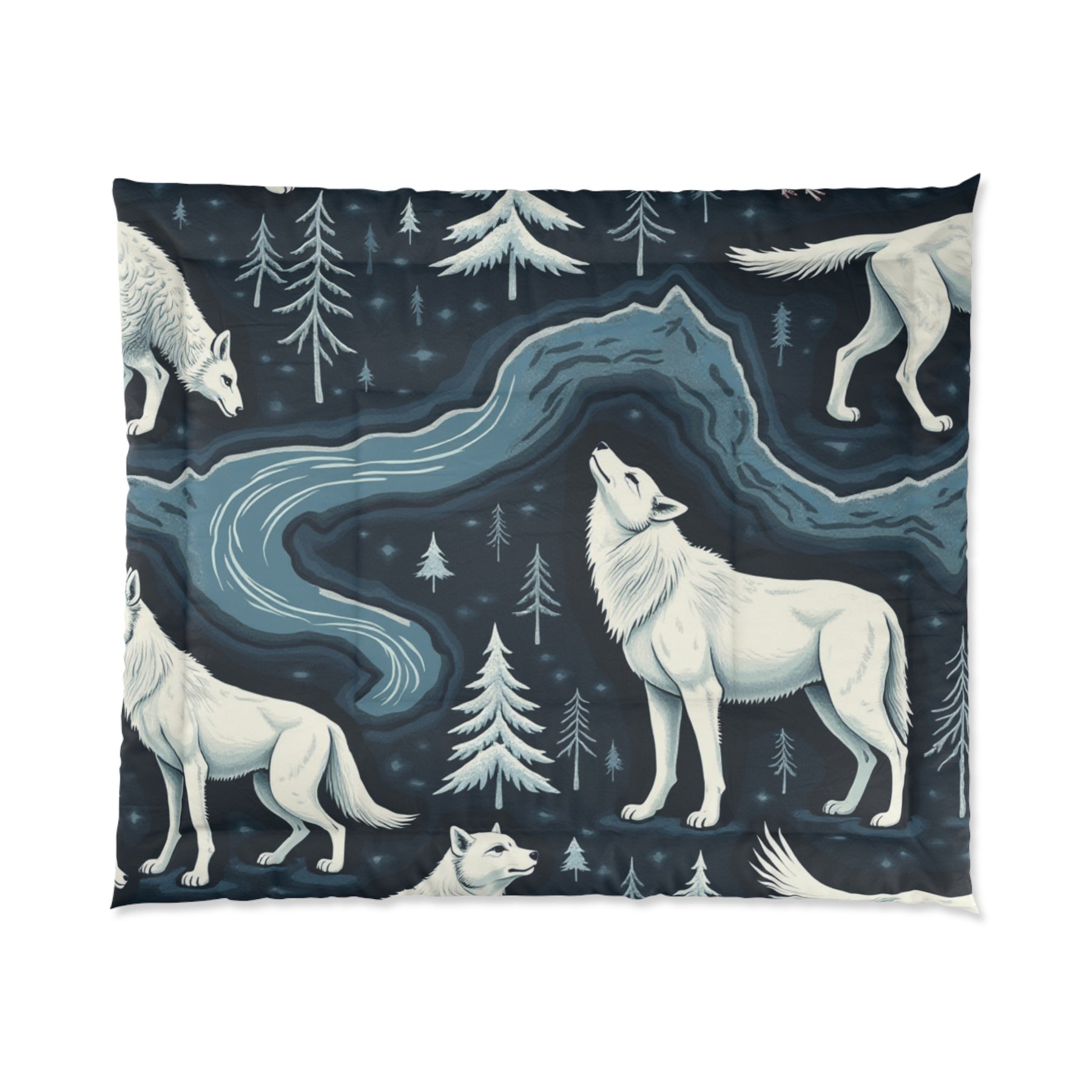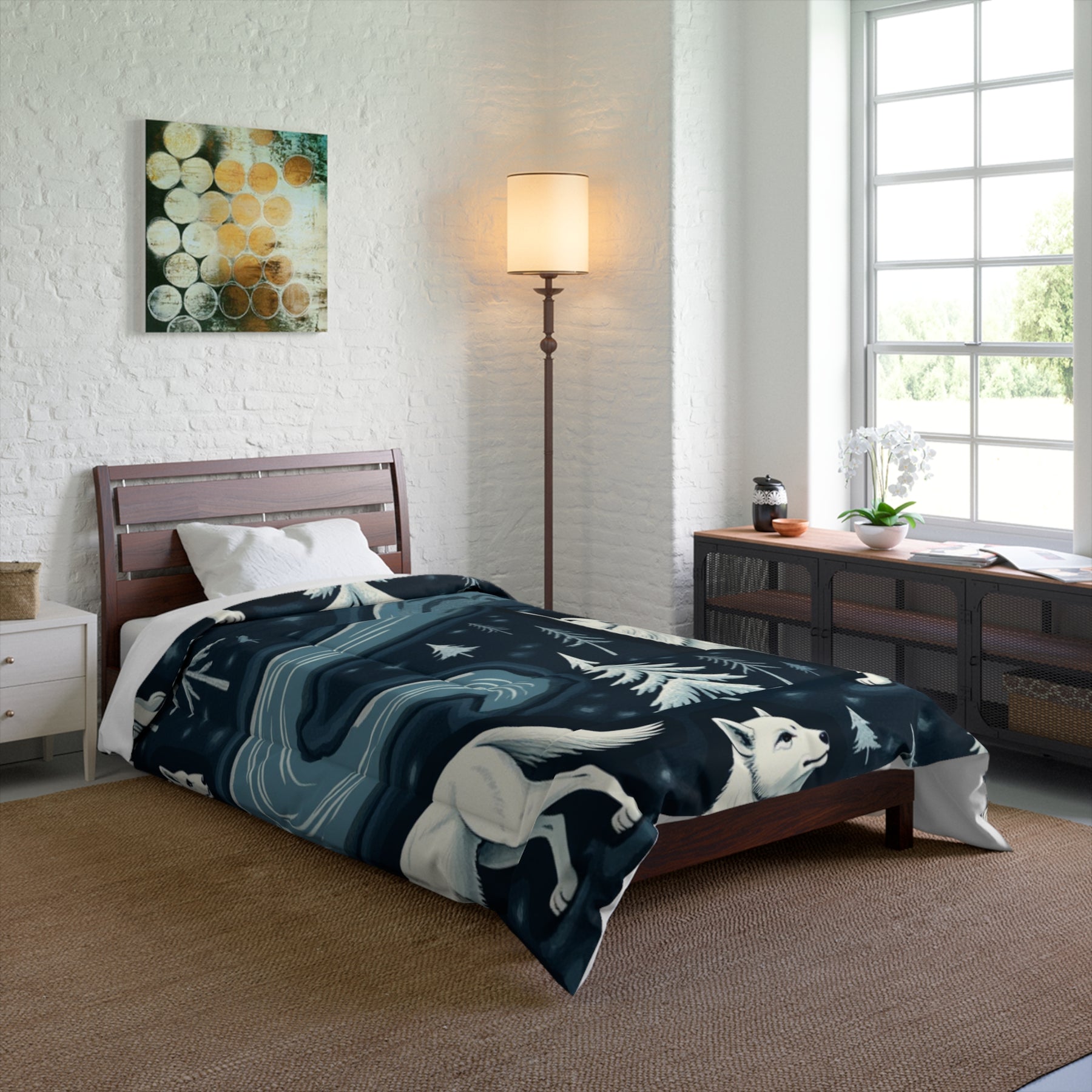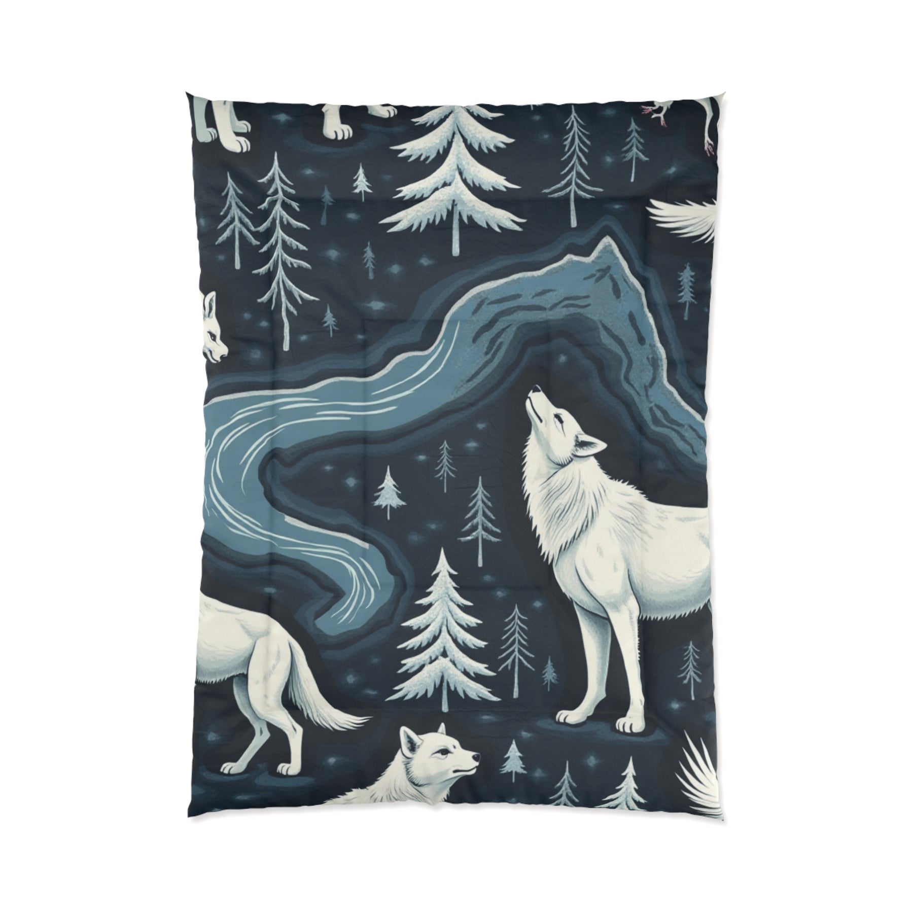 Wrap yourself in a quietly powerful scene: pale wolves move through a starlit forest beside a ribbon of glowing river. The comforter’s deep navy and icy blue palette soothes late-night thoughts and invites slow mornings. It lays across the bed like a storyteller’s blanket — bold imagery that calms rather than shouts. Lightweight and softly brushed, it tucks under arms and around shoulders with a gentle, cozy weight. Whether curling up to read by lamplight or resetting after a long day outdoors, this comforter brings a hushed wilderness energy and a sense of restful escape to the bedroom.