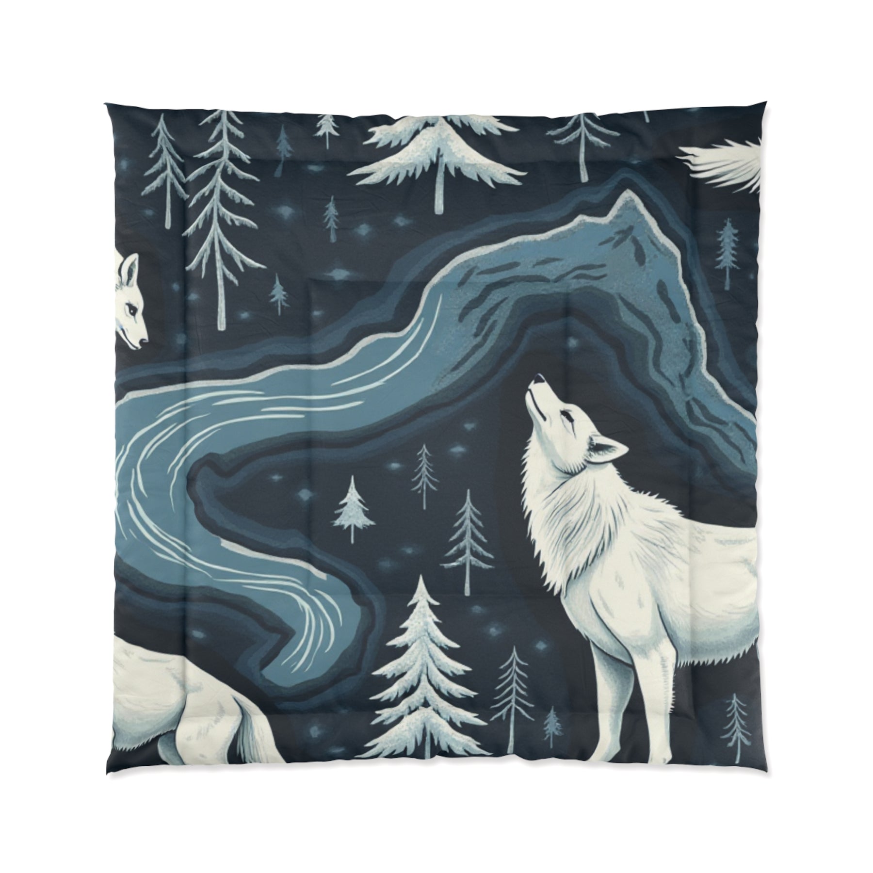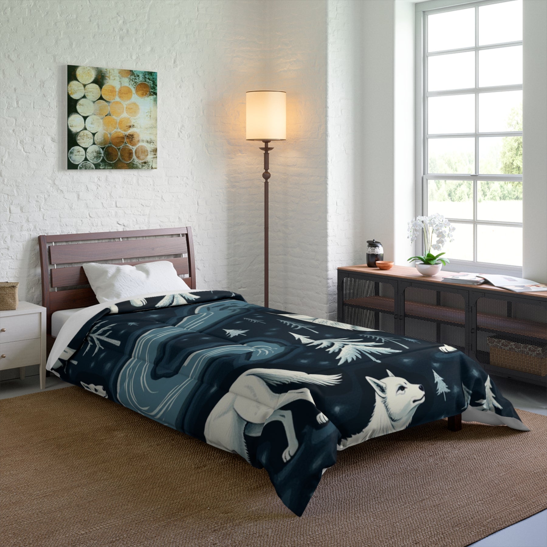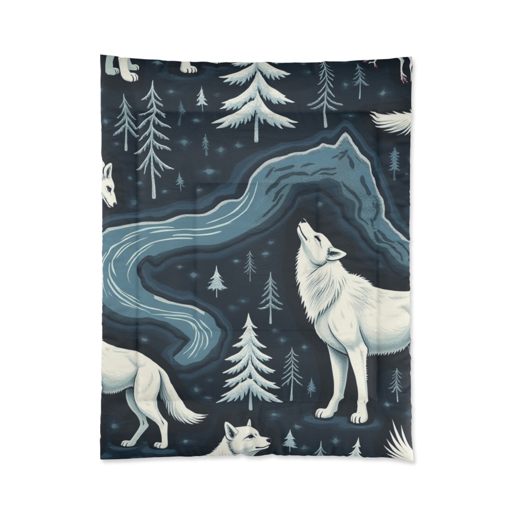 Wrap yourself in a quietly powerful scene: pale wolves move through a starlit forest beside a ribbon of glowing river. The comforter’s deep navy and icy blue palette soothes late-night thoughts and invites slow mornings. It lays across the bed like a storyteller’s blanket — bold imagery that calms rather than shouts. Lightweight and softly brushed, it tucks under arms and around shoulders with a gentle, cozy weight. Whether curling up to read by lamplight or resetting after a long day outdoors, this comforter brings a hushed wilderness energy and a sense of restful escape to the bedroom.