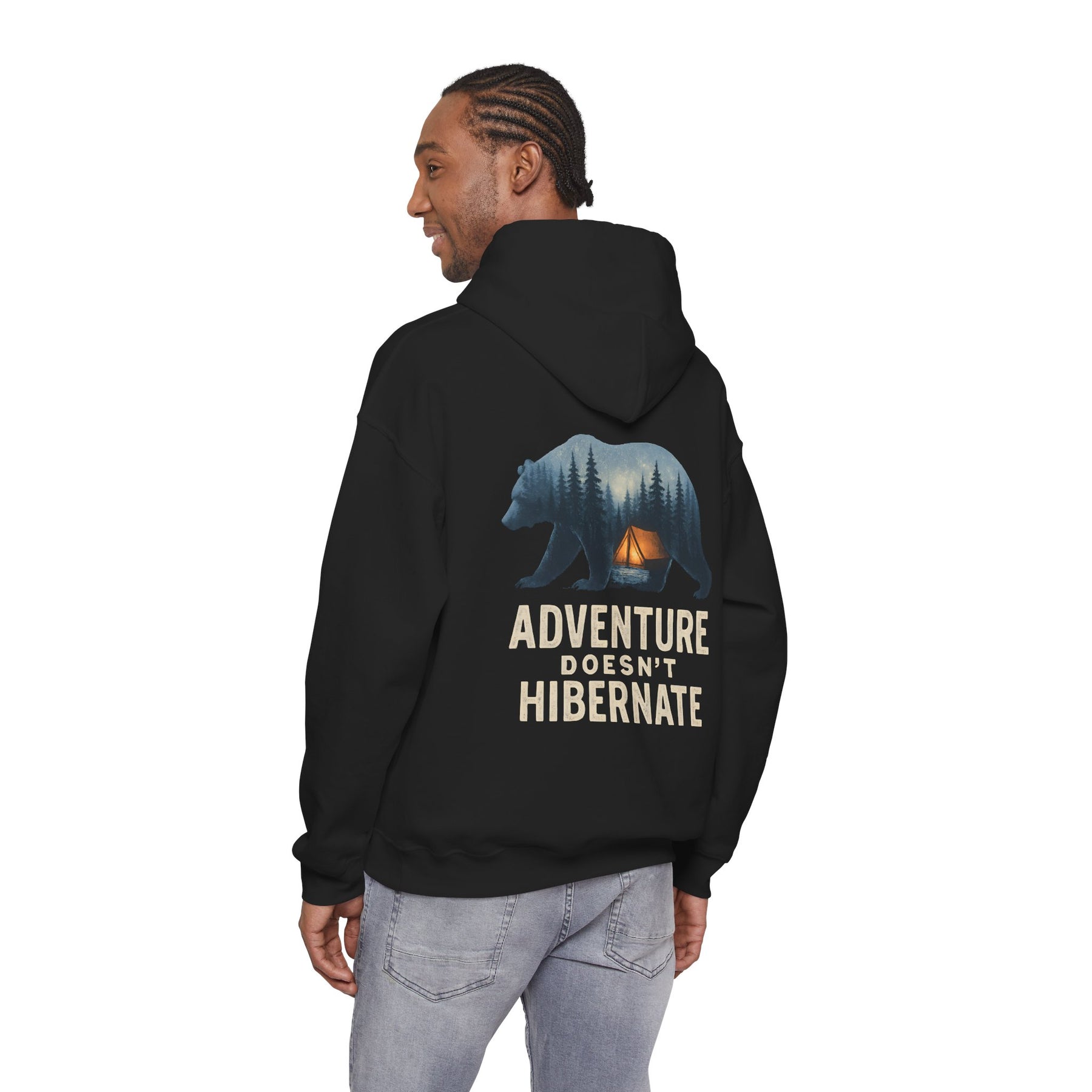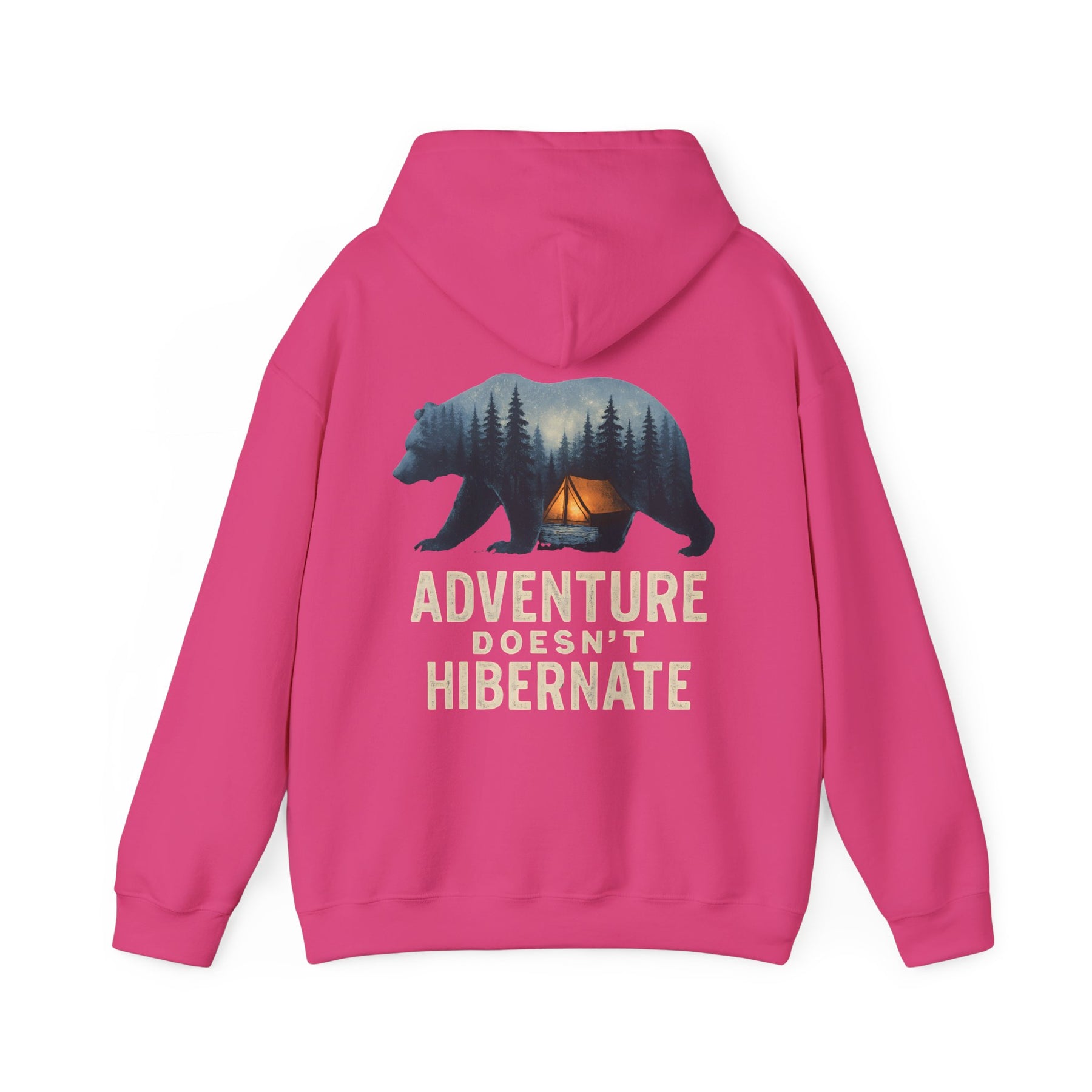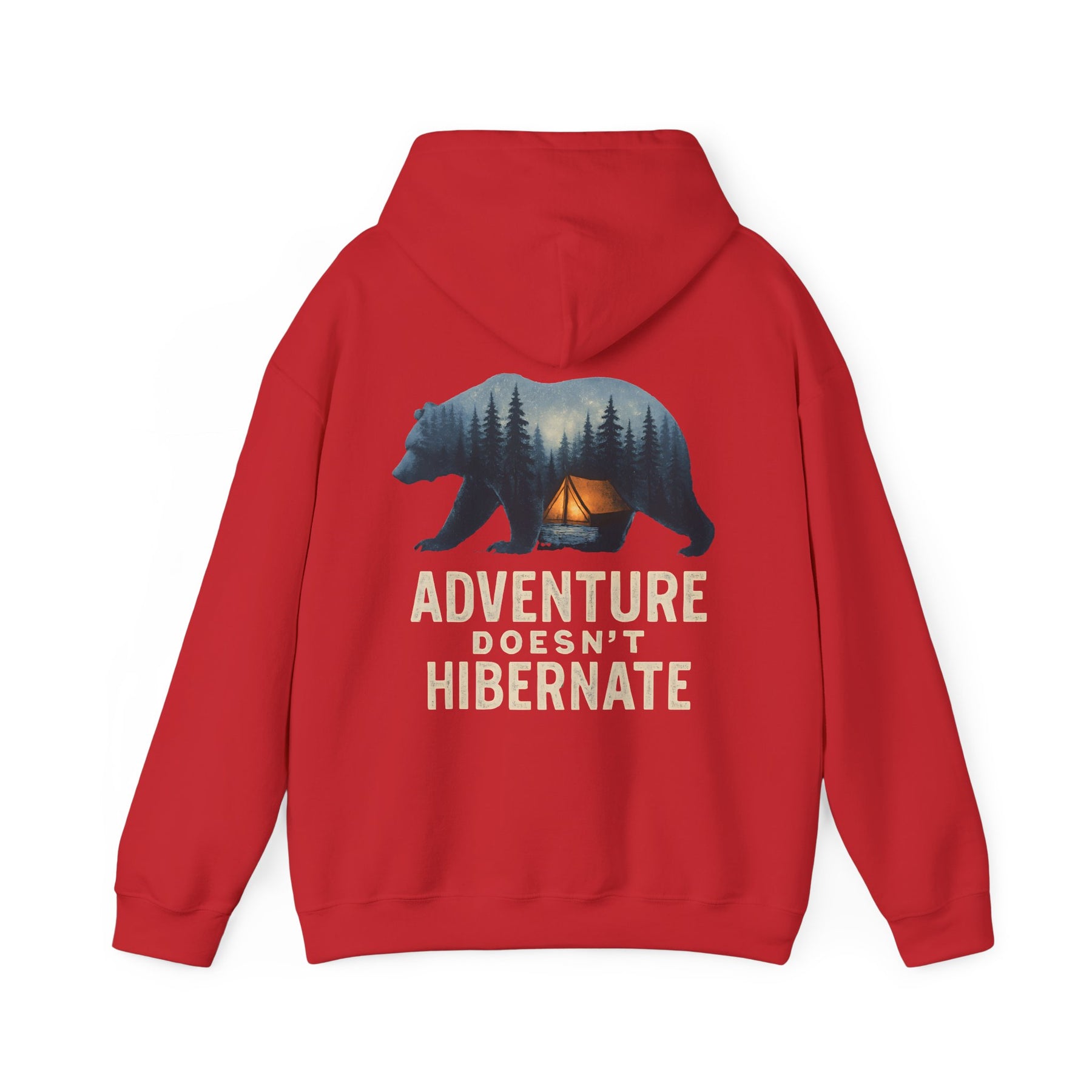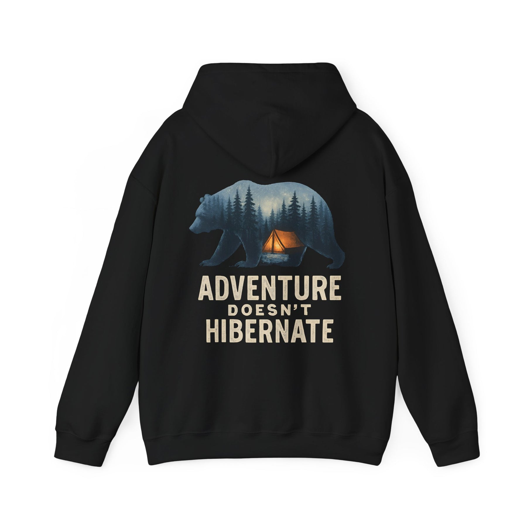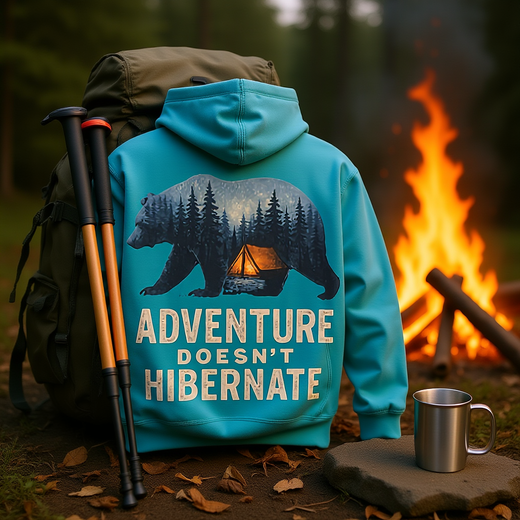 Soft, warm, and quietly bold — this hoodie brings the call of the wild into everyday life. A layered bear silhouette holds a twilight campsite scene, with the phrase “Adventure Doesn’t Hibernate” beneath. Wear it on crisp mornings or late-night drives when you crave a touch of forest calm. The roomy kangaroo pocket and double-lined hood keep hands toasty and spirits ready for the next trail. Subtle enough for daily wear, it still reads like a statement for people who choose the path less traveled.