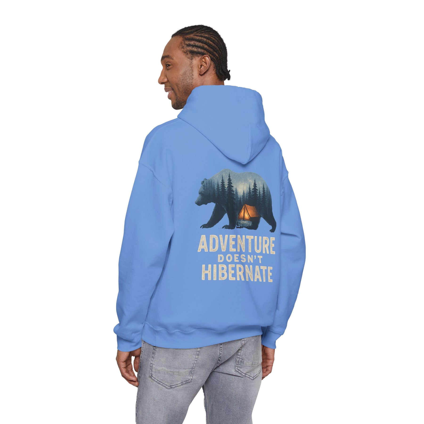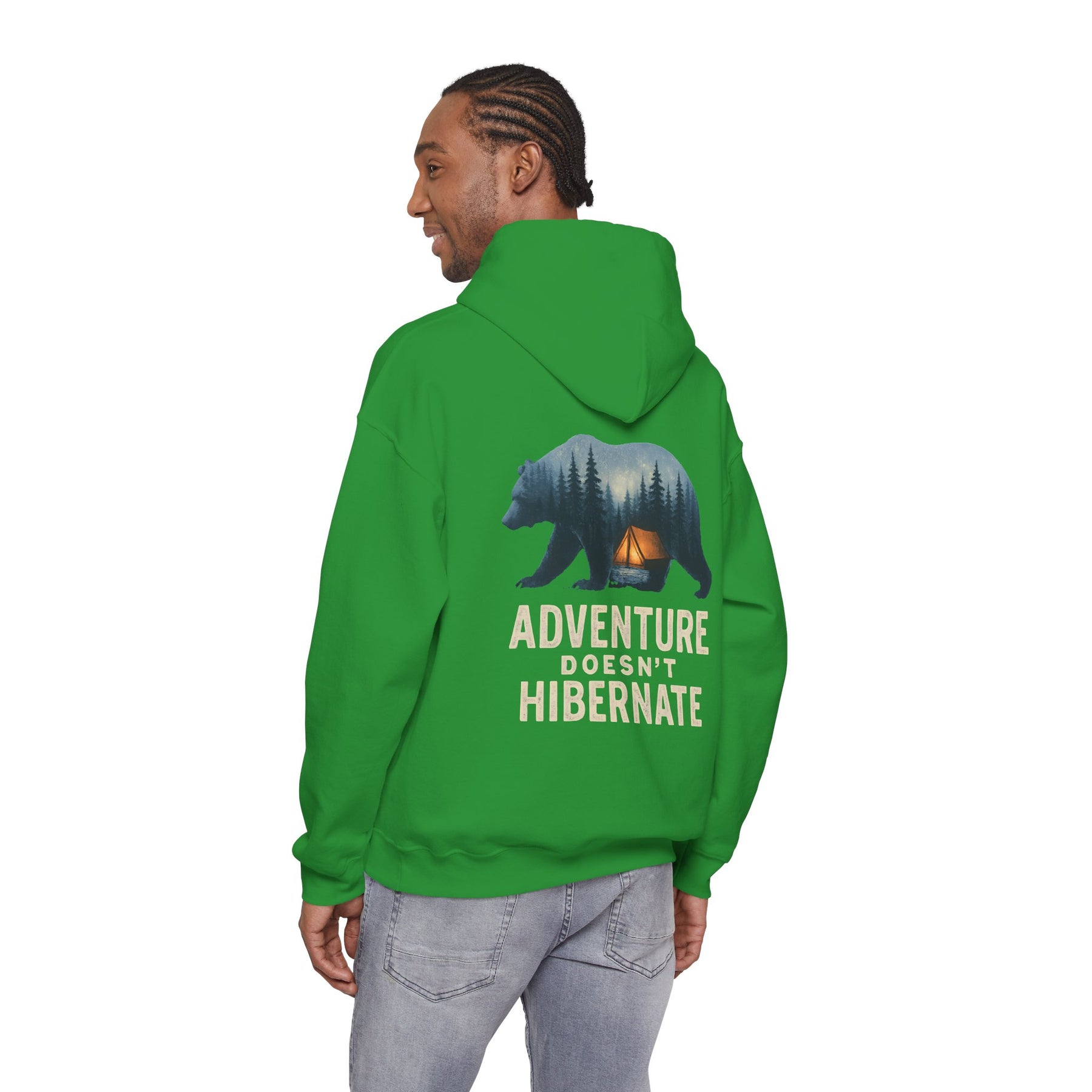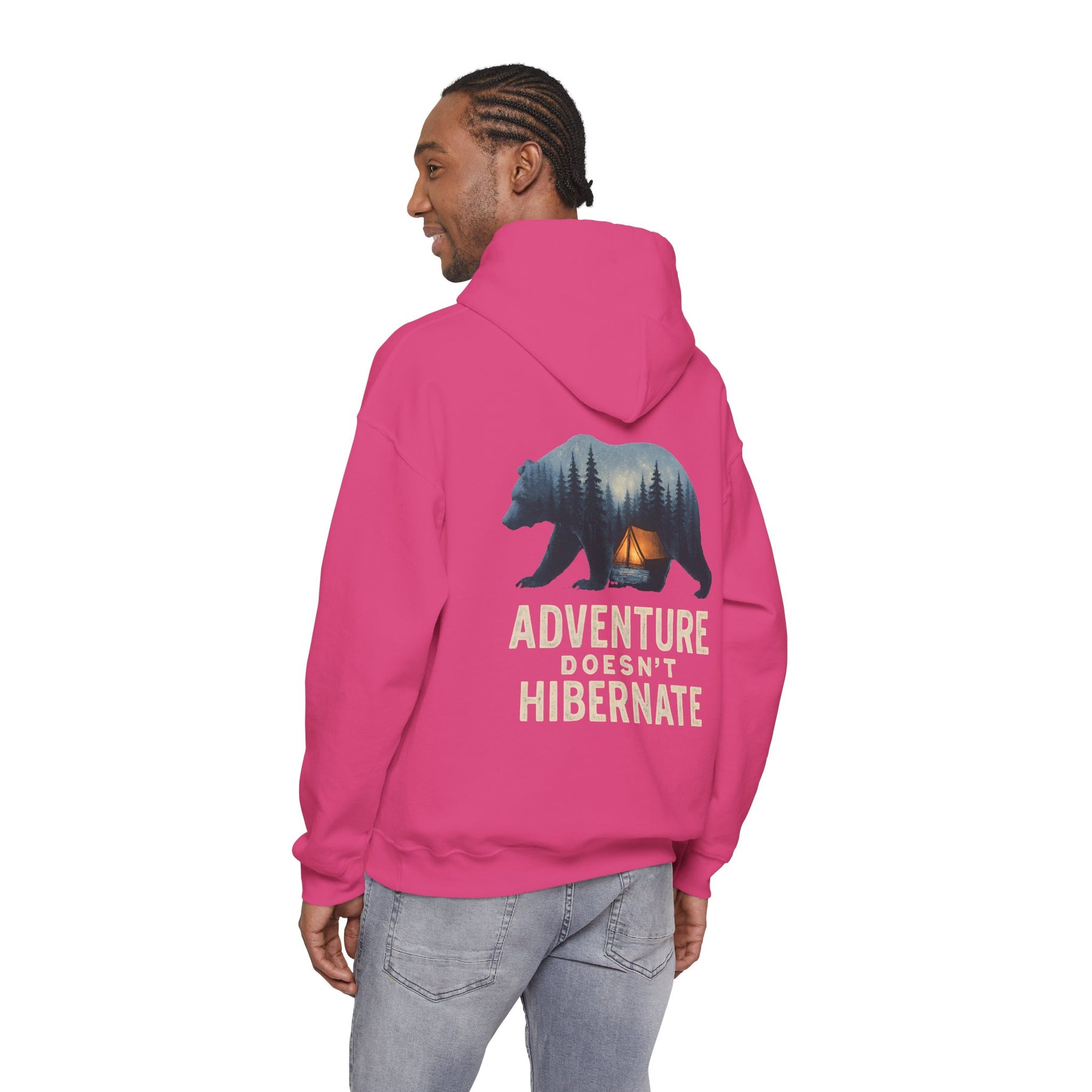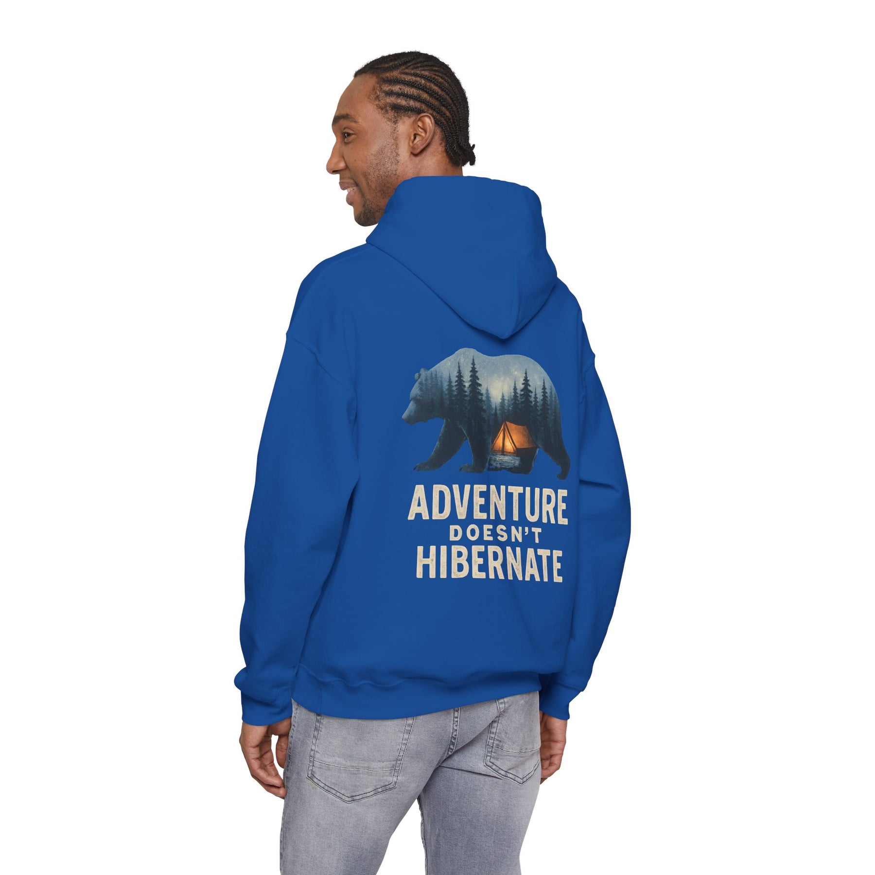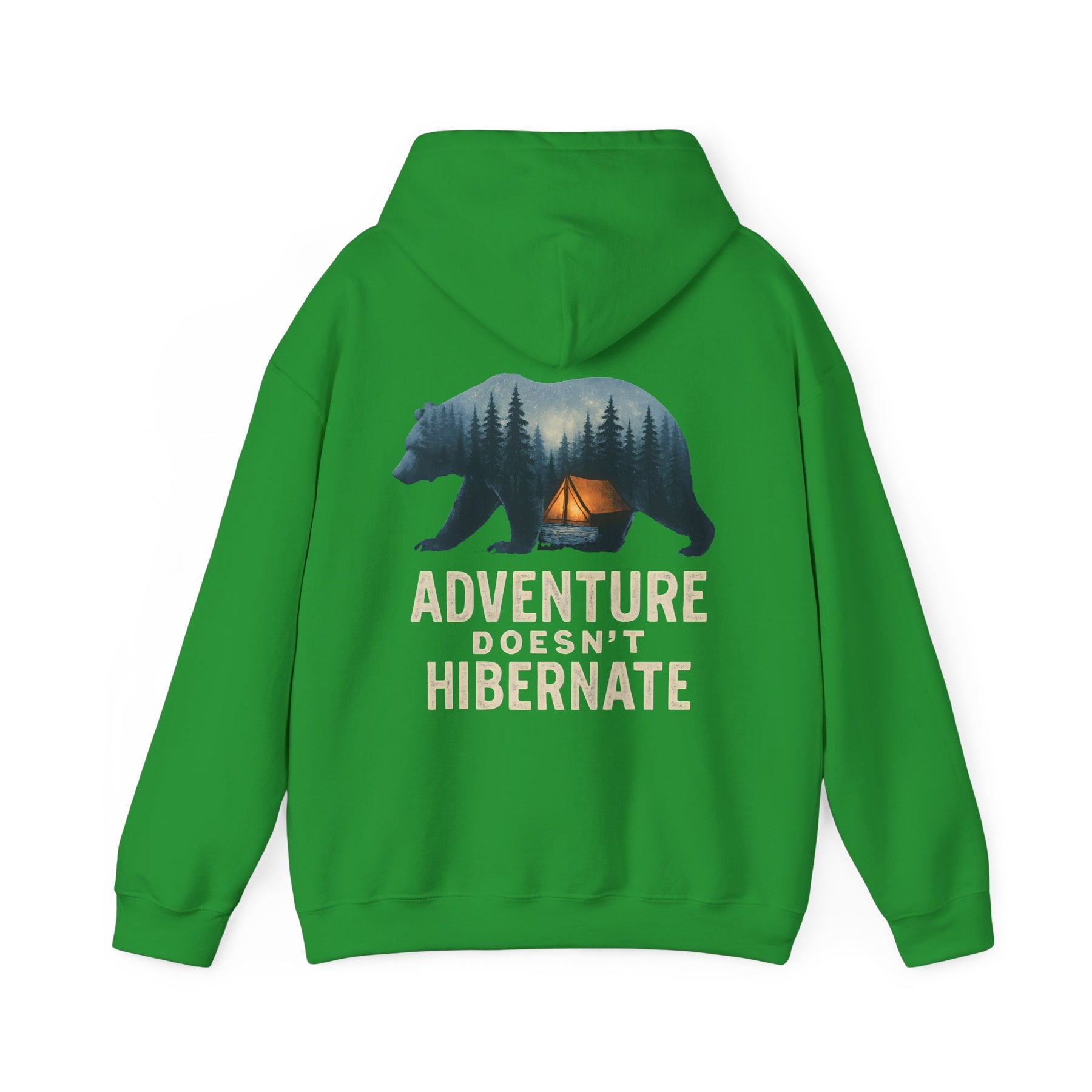 Soft, warm, and quietly bold — this hoodie brings the call of the wild into everyday life. A layered bear silhouette holds a twilight campsite scene, with the phrase “Adventure Doesn’t Hibernate” beneath. Wear it on crisp mornings or late-night drives when you crave a touch of forest calm. The roomy kangaroo pocket and double-lined hood keep hands toasty and spirits ready for the next trail. Subtle enough for daily wear, it still reads like a statement for people who choose the path less traveled.