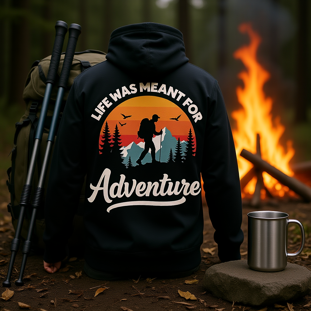 Soft, warm, and quietly bold — this cozy hoodie carries a small sunset emblem on the chest and a larger, vintage-inspired hiking scene across the back. It feels like the slow glow of late-afternoon light after a long trail: familiar, steady, and ready for the next walk. The roomy kangaroo pocket keeps hands warm. A double-lined hood with color-matched drawcord shelters you from wind and chill. Subtle, durable printing and optional embroidery placement let this piece age with you, not against you. Wear it to warm up by the campfire, linger at the trailhead, or slow down on weekend mornings.