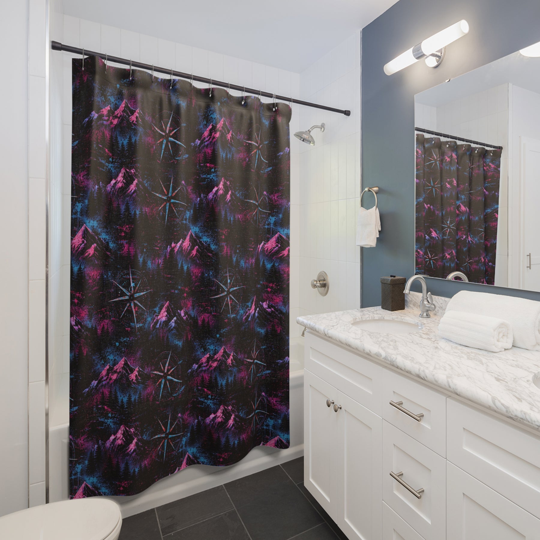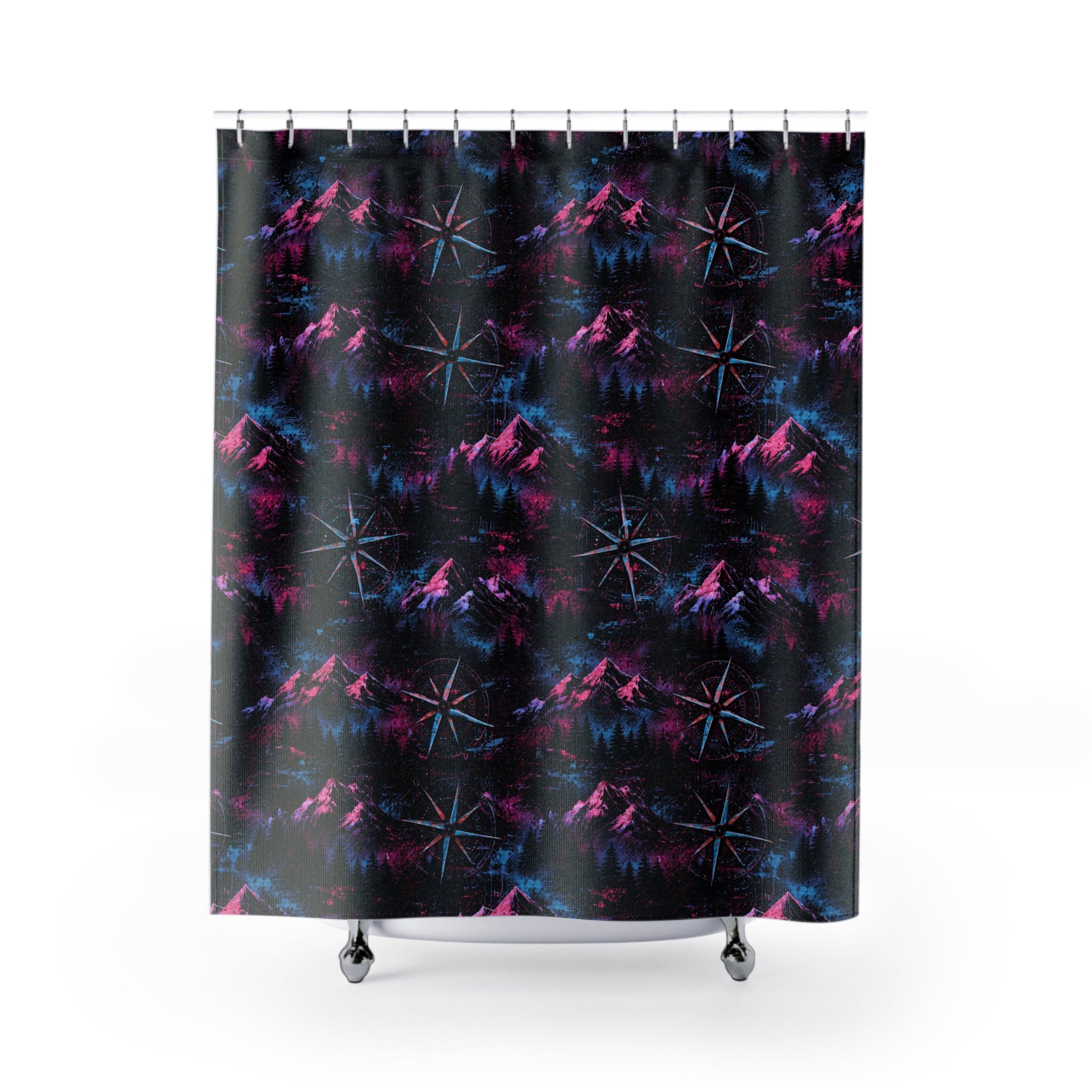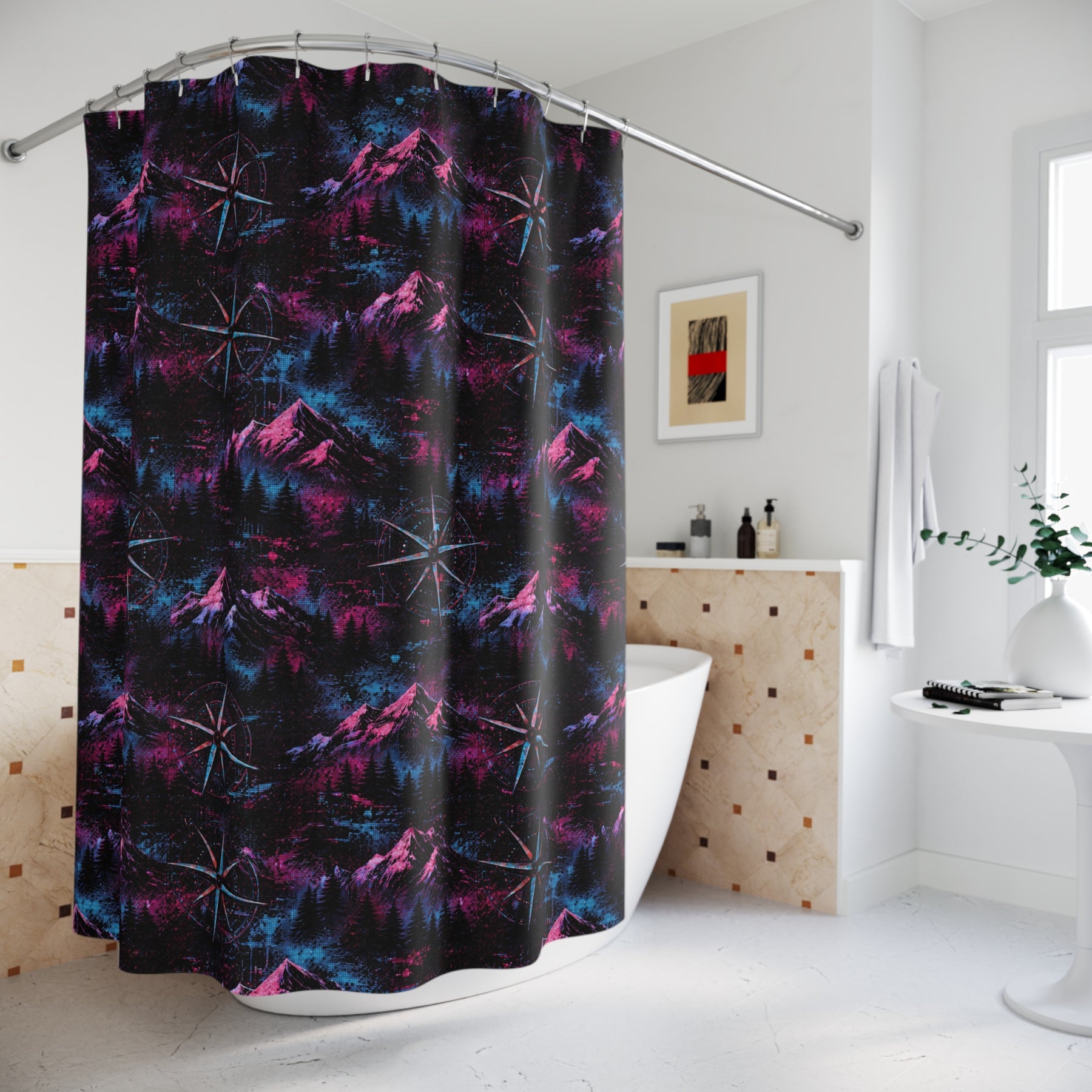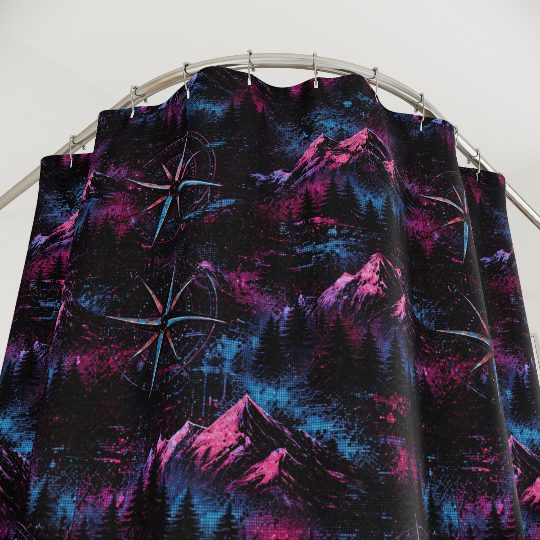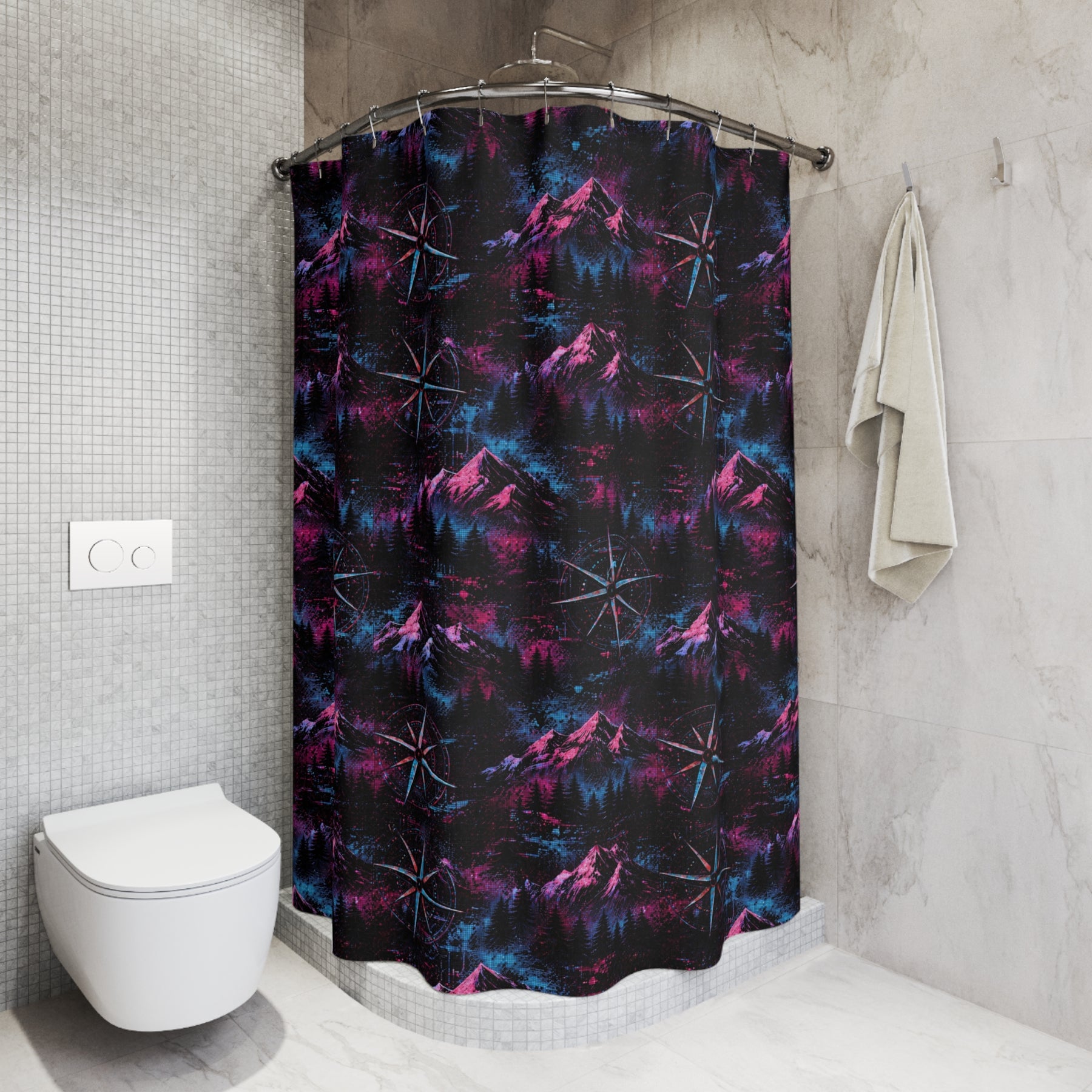 Bring a twilight skyline into your bathroom with this Purple Compass shower curtain. Deep neon purples and an angular mountain silhouette create a quiet, electric atmosphere — like standing on a ridge under a navigation star. It’s bold without shouting; it anchors a minimalist or retro-inspired space and invites a moment of calm ritual every morning and night. The one-sided print keeps the artwork vivid while the polyester fabric resists wrinkles and dries quickly. Hang it on a set of your favorite hooks and let the colors guide your routine toward something a little more cinematic.