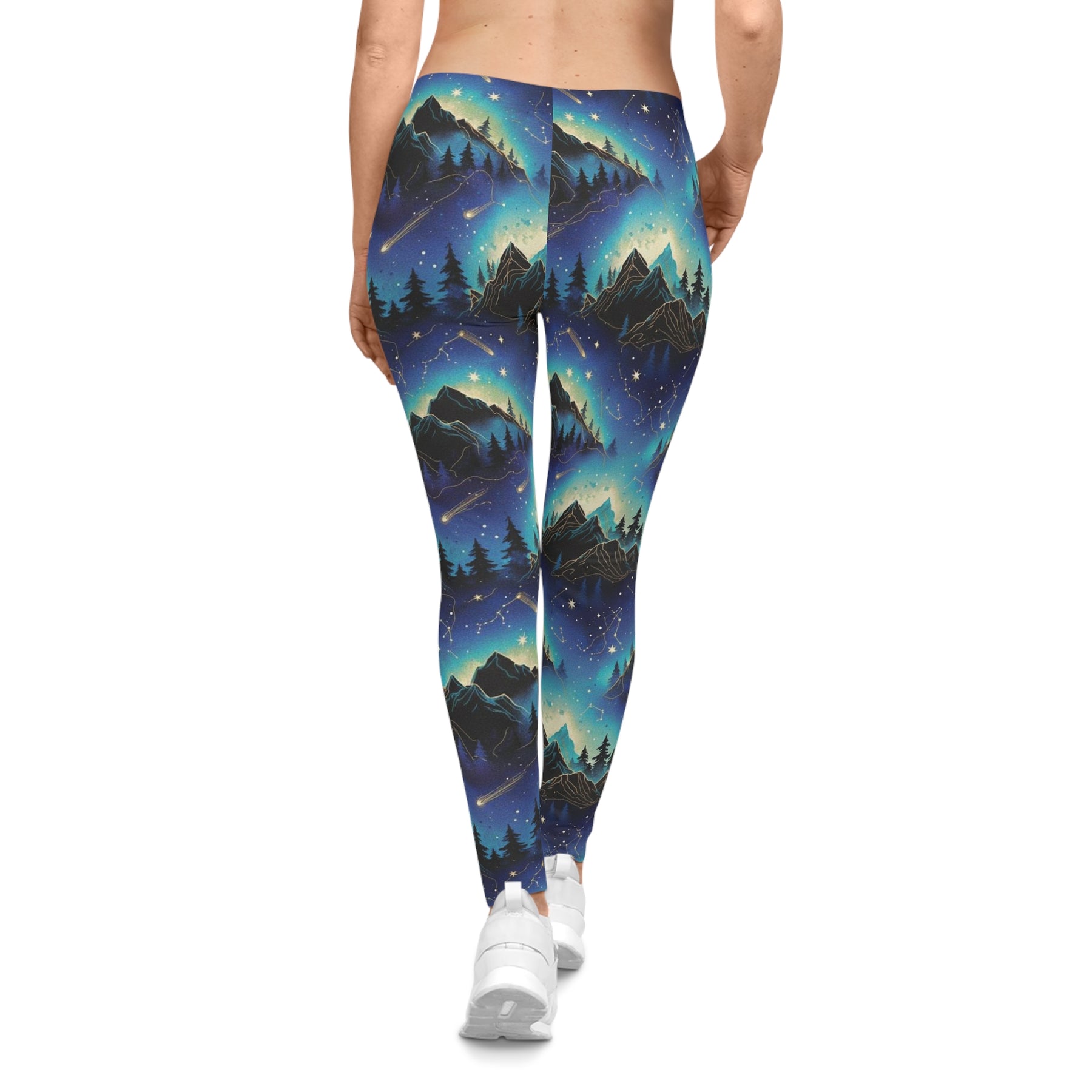 Aurora Mountain Night Leggings. The sky-blue and deep-indigo print wraps your legs in a sweeping view of mountain silhouettes beneath dancing northern lights — like carrying a quiet, starlit trail with you to yoga, a late-night walk, or a cozy evening at home. The mid-rise, thin elastic waistband sits comfortably without digging in, while the silky, full-color surface holds those crisp, vivid hues that make the aurora seem to shimmer as you move. Lightweight and flexible from the polyester-spandex blend, they stretch with lunges and bends and snap back into shape when you’re done. Small thoughtful touches — size and care printed inside the waistband and seam thread matched to the design — keep the focus on the art and the fit. Wear them to ground your practice, to layer under a long sweater for a mountain-drive playlist, or to bring a little cold-night wonder to everyday life.